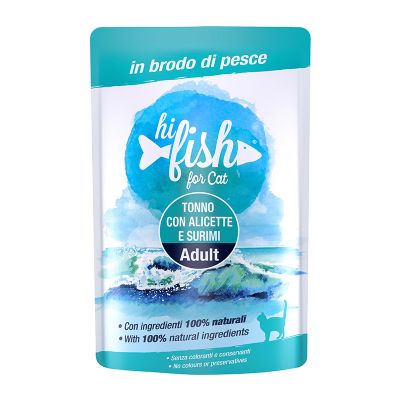 Συμπληρωματική υγρή τροφή με κομματάκια τόνου, γαύρου και σουρίμι, σε σάλτσα, για ενήλικες γάτες. Παρασκευάζεται με φυσικά συστατικά, και περιέχει όλες τις απαραίτητες θρεπτικές ουσίες για την καθημερινή διατροφή της γατούλας σας. Δεν περιέχει χρωστικές ουσίες, συντηρητικά, τεχνητά αρώματα ή σάκχαρα. Είναι ο ιδανικός τρόπος για να προσφέρετε στη γάτα σας επιπλέον ενυδάτωση, που είναι τόσο σημαντική για την υγεία της.