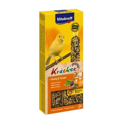 Τραγανά κράκερ με μέλι και σουσάμι, για καναρίνια. Ψήνονται σε φυσικό ξύλο για μεγάλη διάρκεια και απασχόληση. Περιέχουν μέλι, σουσάμι και δημητριακά, που προσφέρουν ενέργεια και ποικιλία στη διατροφή, και βοηθούν στη φυσική φθορά του ράμφους. Η συσκευασία περιέχει 3 ίδια κράκερ.