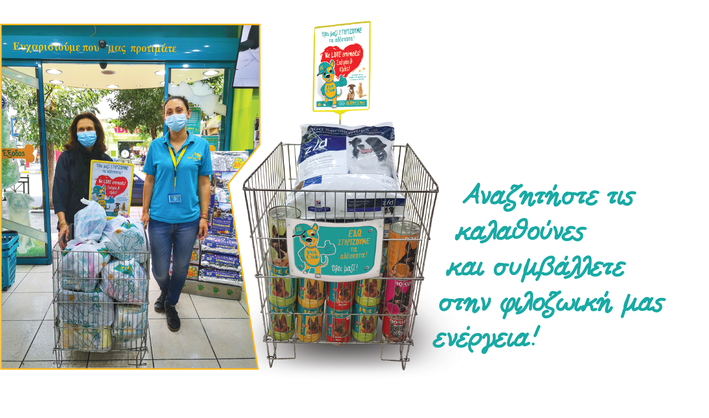 WE LOVE ANIMALS... ΣΚΕΨΟΥ ΚΑΙ ΕΜΑΣΌπως έχει αποδείξει ο χρόνος, μια φράση από μόνη της δεν έχει νόημα αν δε συνοδεύεται από πράξεις! Η Pet City στα πλαίσια αυτού που πρεσβεύει και που δεν είναι άλλο από το "τα πάντα για τους πιστούς μας φίλους" από τον Οκτώβριο του 2013 ξεκίνησε μία πολύ μεγάλη ενέργεια για τη συλλογή τροφίμων, απαραιτήτων αξεσουάρ και φαρμάκων για τα αδεσποτάκια διαφόρων περιοχών της Αθήνας.